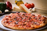 Pepperoni, Italian sausage, meatballs, mushrooms, onions, green peppers, black olives, and mozzarella.